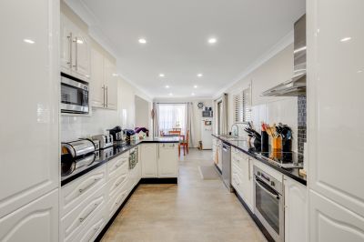Open plan living and dining flowing onto a well-appointed kitchen with stone bench tops and dishwasher
