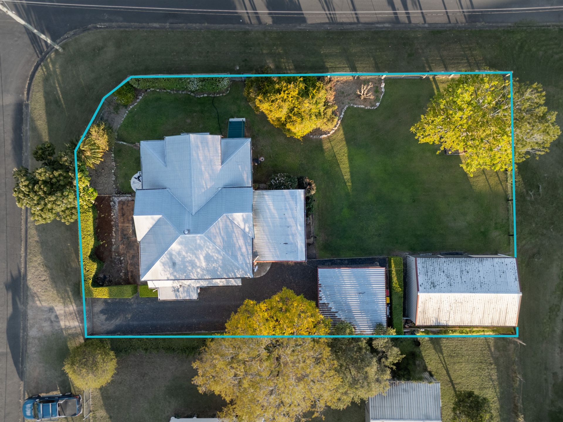 Practical infrastructure complements the home, with a double carport, a 6m x 9m shed, and additional workshop space under the house ideal for hobbies, storage, or projects.