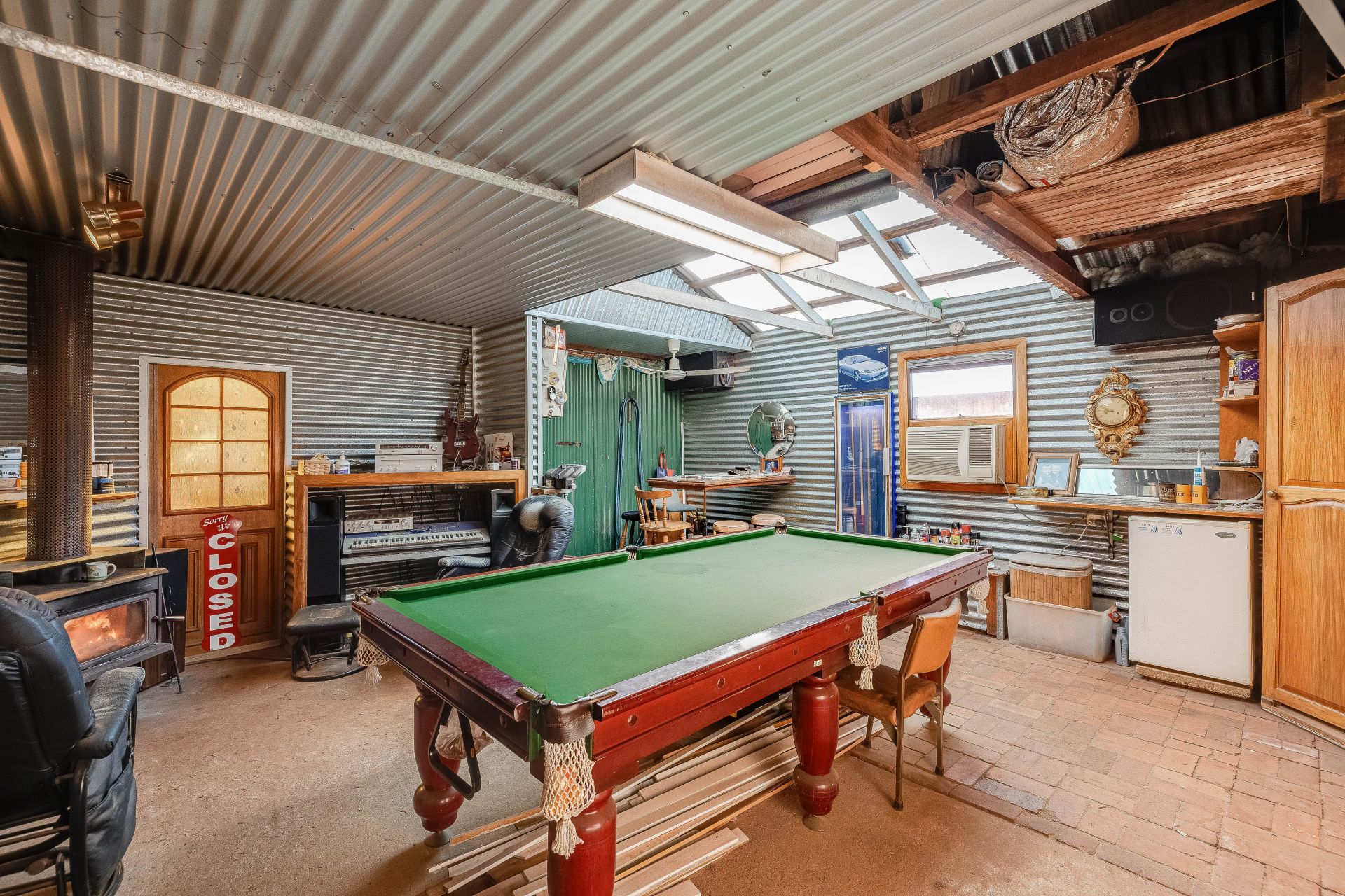 Man cave with a wood heater and second shower